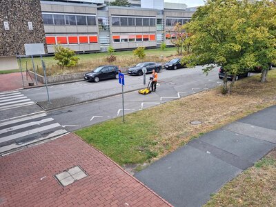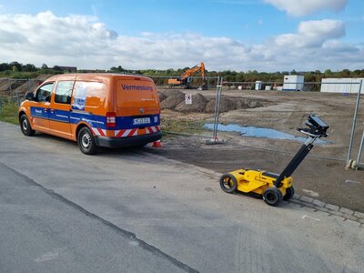 Im Sommer 2025 fiel der Startschuss für die Vermessungsarbeiten für den Neubau der Medizinischen Hochschule Hannover (MHH). Zum Aufgabenfeld der Vermessungsingenieur:innen zählten zunächst einmal Vermessungsleistungen wie das Aufmaß der Carl-Neuberg-Straße, des Stadtfelddamms oder des Eilenriedegrabens. Das Gelände selbst war zu diesem frühen Zeitpunkt noch nicht freigegeben worden. Zum einen war die Einebnung noch nicht abgeschlossen, zum anderen hatte der Kampfmittelräumdienst noch keine Freigabe erteilt. Die ersten Arbeiten umfassten zum Beispiel Erkundungen des Untergrundes mittels Georadar.