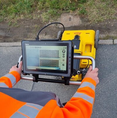 „Das Ganze erinnert optisch an einen Rasenmäher. Den schiebt man über die Straße, er sendet permanent Radarwellen in den Boden und wir erhalten Ausschläge auf unserem Display. Sieht man einen Huckel, weiß man, da ist eine Anomalie im Boden. Oft ist die Anomalie lang und linienförmig – dann handelt es sich um ein Rohr oder eine Leitung.“, erklärt Kai Tamms.